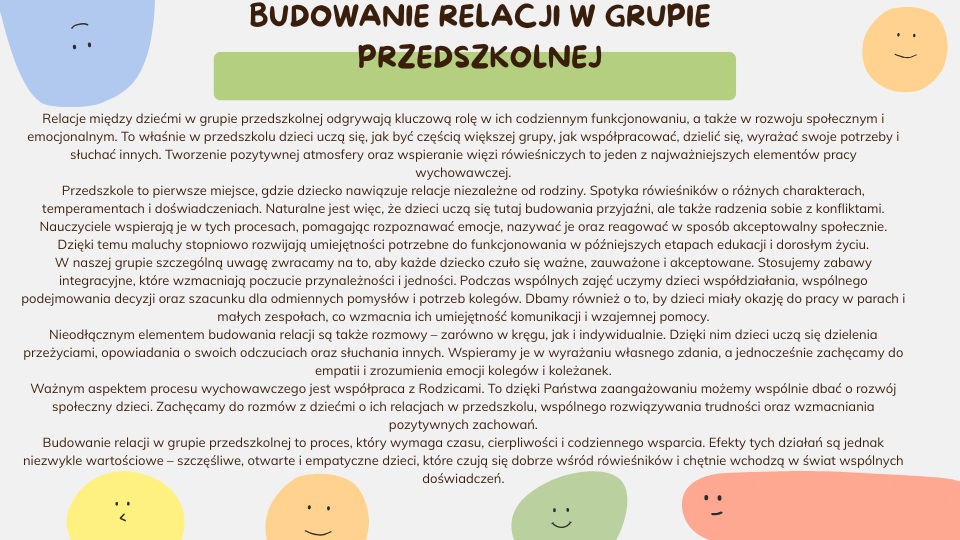 W przedszkolu dbamy o to, aby każde dziecko czuło się bezpieczne i akceptowane – to właśnie w atmosferze zaufania mowa rozwija się najpełniej. Wspierając emocje i relacje w grupie, wspieramy jednocześnie rozwój komunikacji, który jest kluczem do budowania świata małego człowieka.